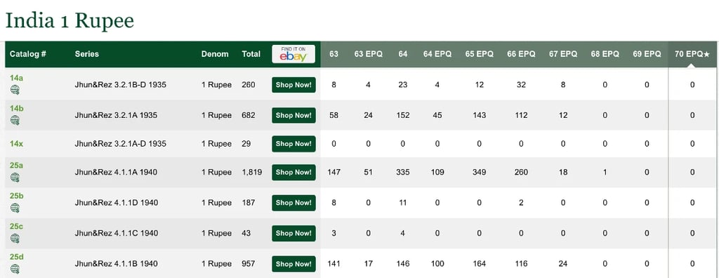 The example above shows a PMG population report for India 1 Rupee banknotes. To explore the full dataset, you can also view the official India 1 Rupee population report on PMG.